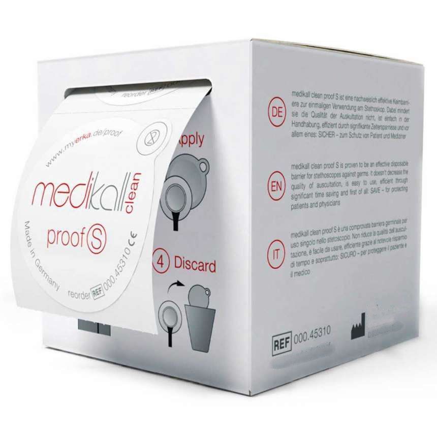 La barrière anti-germes medikall clean proof S est une feuille auto-adhésive qui protège la tête du stéthoscope contre les germes. La membrane du stéthoscope est particulièrement exposée à une charge microbienne élevée. Pour protéger les patients et le personnel médical, cette feuille adhésive contribue à une hygiène efficace. La qualité de l'auscultation n'est pas influencée par la barrière anti-germes. La feuille est collée sur l'entonnoir du stéthoscope avant l'examen et est simplement jetée après le contact avec le patient. Cela permet de gagner du temps et constitue une solution hygiénique pour tous les stéthoscopes disponibles dans le commerce.